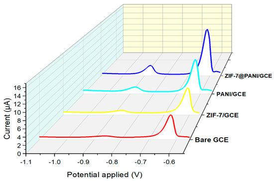 The feasibility of the ZIF-7@PANI/GCE sensing electrode was evaluated for the simultaneous electrochemical determination of Cd2+ and Pb2+ ions in the same solution. DPV was employed to investigate the electrochemical response of 10 µM of both Cd2+ and Pb2+ using various modified electrodes. As depicted in Figure 5, the electrochemical behavior of these ions on different electrodes reveals two distinct peak voltages. For the bare GCE, two relatively weak peaks corresponding to the oxidation of each metal are observed at potentials of −0.92 V and −0.62 V, respectively. In contrast, the ZIF-7/GCE electrode shows a slight decrease in the response currents, and the oxidation potentials shift to −0.86 V and −0.61 V, respectively. When the electrode surface is modified with PANI, the current values increase to 10.27 μA for Cd2+ oxidation and 2.06 μA for Pb2+ oxidation. Remarkably, the oxidation responses of Cd2+ and Pb2+ ions increase by 2.5 times on the ZIF-7@PANI/GCE compared to the bare GCE. These results strongly suggest that the combination of PANI and ZIF-7 creates novel pathways for the oxidation of these ions on the electrode surface. The synergy between PANI and ZIF-7 enhances the electrocatalytic activity for Cd2+ and Pb2+, resulting in higher current responses at lower oxidation potentials for these ions.