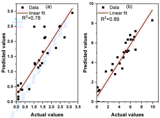 The statistical analysis results in Table 2 and Figure 6 demonstrate that both models have high R2 values and, thus, an excellent overall fit to the data. The values of suggest that both prediction models are reasonably robust. The performance of two models on new unseen data is reasonably good.