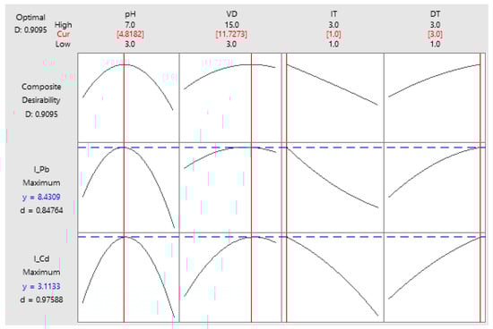 The desirability function approach was used to optimize the heavy metal sensor by determining the ideal peak current values for Cd2+ and Pb2+ ions. The response variable (peak current for both ions) was set to “maximum” to attain the best sensor performance or desirability value, while the desired operational parameters (pH, deposited drop volume, incubation time, and drying time) were chosen within the investigated experimental range. Based on the response objective, this methodology was applied to maximize the overall desirability function. Regression analysis identified the optimal conditions as pH = 4.8, DV drop volume = 11.73 µL, incubation time IT = 1 min, and drying time DT = 3 h (Figure 7). The optimal pH of 4.8 for the simultaneous electrochemical detection of Pb2+ and Cd2+ is supported by electrochemical principles. At this slightly acidic pH, both metal ions remain in their electroactive forms, preventing precipitation as hydroxides, which occurs at higher pH levels [46]. Lower pH values can lead to competition from H+ ions, reducing detection sensitivity by interfering with the adsorption of metal ions onto the electrode surface [47]. Additionally, pH 4.8 minimizes interferences from other species in complex matrices, ensuring selective detection of Pb2+ and Cd2+ [48]. Research indicates that the optimal pH range for detecting these ions typically falls between 4.5 and 5.0, where both ions remain soluble and electroactive [49]. Furthermore, modified electrode surfaces at this pH facilitate efficient adsorption of these ions through favorable interactions with functional groups on the electrode material, enhancing the electrochemical response and improving sensitivity [50].