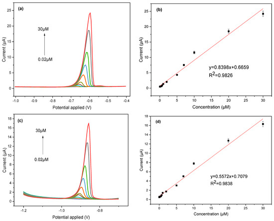 Using the optimal experimental parameters recommended by the model, the distinct detection capability of the ZIF-7@PANI/GCE sensor for Pb2+ and Cd2+ ions was investigated through DPV measurements. As illustrated in Figure 8, the dissolution peaks current increased linearly with the rising concentration of the target heavy metal ions. The peak current for Pb2+ shows a linear correlation with concentrations ranging from 0.002 µM to 30 µM, following the regression equation Ip (μA) = 0.8398 C (µM) + 0.6659 (R2 = 0.9826). Similarly, Figure 8b,d depicts a linear calibration curve for Cd2+ over the same concentration range, described by the equation Ip (μA) = 0.5572 C (µM) + 0.7079 (R2 = 0.9838). These results confirm the ZIF-7@PANI/GCE sensor’s high sensitivity and effective detection capabilities for Pb2+ and Cd2+ ions. This enhanced performance is attributed to the significant specific surface area and structure of the ZIF-7 matrix, which provides numerous active sites for ion interaction. Additionally, the ZIF-7@PANI composite benefits from the synergistic effects of PANI and ZIF-7, where PANI facilitates the electron transport process and the abundant -COO− groups in ZIF-7 promote the pre-enrichment of Pb2+ and Cd2+ on the electrode surface.