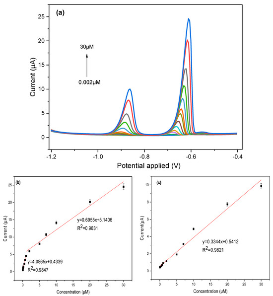 A simultaneous analysis of Cd2+ and Pb2+ was conducted under the optimized conditions using the ZIF-7@PANI/GCE sensor, with a 1 min accumulation time. The tested ion concentrations ranged from 0 to 30 µM. As shown in Figure 9a, the DPV responses of Pb2+ and Cd2+ increased progressively with rising ion concentrations. Calibration curves for Pb2+ and Cd2+ were subsequently plotted, as illustrated in Figure 9b and Figure 9c, respectively. For Pb2+ detection, the analysis revealed two distinct sections, likely due to different adsorption behavior at low and high concentrations on the ZIF-7@PANI/GCE sensor surface. Notably, Pb2+ ions exhibited higher sensitivity at lower concentrations, suggesting that metal ions initially interact with the most active sites, while at higher concentrations, they progressively occupy less active sites [52]. The regression equations for Pb2+ were Ip (µA) = 4.0865 C (µM) + 0.4339 (R2 = 0.9847) within the 0.002–1 µM range and Ip (μA) = 0.6955C (µM) + 5.1406 (R2 = 0.9631) for 1–30µM (Figure 9b). For Cd2+, a single linear response was observed over the entire concentration range, following the equation Ip (µA) = 0.3344 C (µM) + 0.5412 (R 2 = 0.9821) from 0.02 µM to 30 µM (Figure 9c). The limits of detection (LOD) were calculated using the 3S/N method, yielding values of 2.93 nM for Pb2+ and 10.6 nM for Cd2+, confirming the sensor’s high sensitivity and suitability for trace metal ion detection.