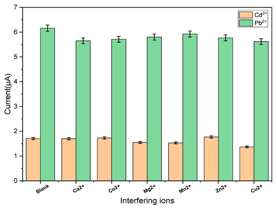 The specificity of the ZIF-7@PANI/GCE sensor toward 5 μM Cd2+ and Pb2+ against 50 µM Ca2+, Co2+, Mg2+, Mn2+, Zn2+, and Cu2+.