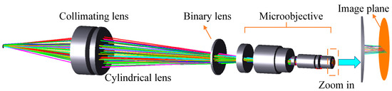 The overall structure of the line spot spectral confocal sensor is illustrated in Figure 2. The light source in the structure uses a fiber with a diameter of 50 μm, enabling the white light source to function as a point-light source after passing through the fiber. A slit is not directly used to generate a linear light source because it significantly reduces light intensity, preventing sufficient signal from returning to the spectrometer. To improve the light source utilization, a double-glued lens and a cylindrical lens were employed to convert the point light source into a line-light source. This method effectively enhances the light intensity and improves the object side of the numerical aperture (NA). In the dispersion section, a binary diffractive lens is used to replace the traditional refractive lens group, eliminating aberrations caused by light passing through spherical lenses and reducing the overall design complexity. The focusing section employs a 20× microscope objective, which improves the system’s measurement accuracy and axial resolution and effectively minimizes the impact of the binary diffractive lens.