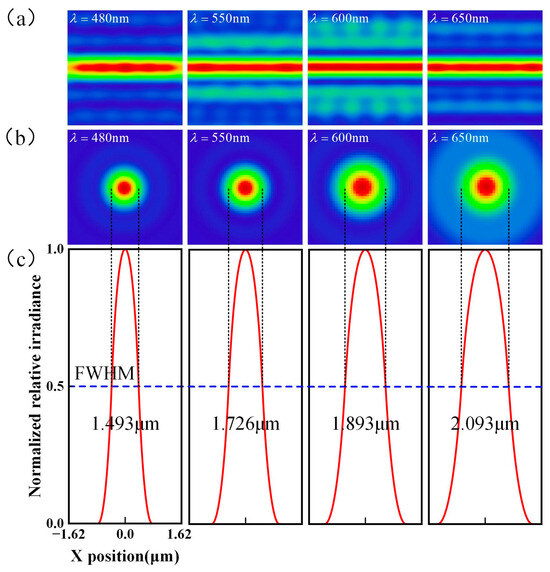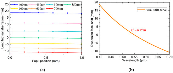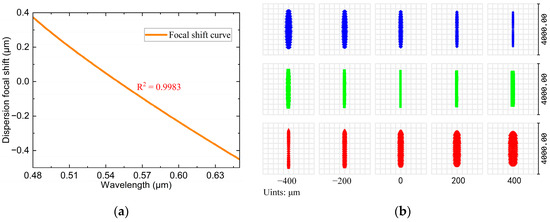 Figure 3a,b illustrates that the primary aberration generated by a single diffractive lens during focusing is a spherical aberration. The axial chromatic aberration curves for different wavelengths show that the spherical aberration reaches the millimeter scale. Consequently, using a single diffractive lens for focusing results in a large spot size increases the measurement error and reduces the axial resolution. Therefore, it is generally necessary to match other lenses. However, the axial chromatic aberration curves also reveal that the spherical aberration curves for different wavelengths exhibit almost identical trends, indicating consistent spherical aberration characteristics of various wavelengths. This consistency facilitates a unified correction across the entire spectral band. The chromatic focal shift curves reveal that the single diffractive lens has a wide operating range and relatively good dispersion performance, achieving 29.467 mm over a wavelength range of 400–700 nm, with an R2 of 0.9790.