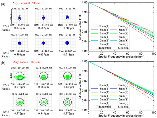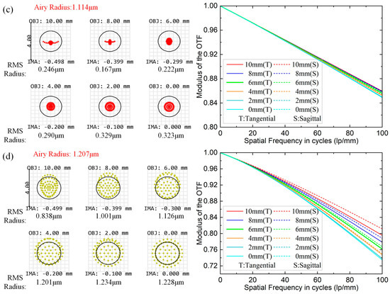 To address the limitations of using binary diffraction lenses, measuring the range of the control system, and improve the measurement accuracy and resolution, we integrate a 20× microscope objective lens behind the binary lens to magnify the measured area. Owing to the small aberration and outstanding image quality of the objective lens, it introduces negligible additional aberrations, effectively mitigating issues caused by using binary lenses. As shown in Figure 4, the imaging of the full field of view of the used micro-objective is evaluated by analyzing the spot diagram and the modulation transfer function (MTF) for four wavelengths between 480 and 650 nm. The simulation results indicate that the spot diagram RMS radius is smaller than the airy spot radius in the whole wavelength range, reaching the diffraction limit. Additionally, the Nyquist cutoff frequency is greater than 0.7 at 100 lp/mm, indicating the outstanding imaging effect of the microscope objective.