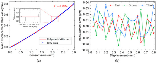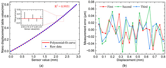 The calibration curves and some interval fitting errors are illustrated in Figure 8a with an R2 = 0.9954 and outstanding linearity. The calibrated curves were used for displacement measurements. The same silicon wafer, fixed on the nano-displacement stage, was used as the measured object. Three measurements were conducted for the full-scale range, and the data of the nano-displacement stage and sensor values were recorded once for every 40 μm of movement, resulting in a total of 20 points. The error curves in Figure 8b indicated a maximum error of 0.037 μm across the three measurements, with a maximum standard deviation of 0.018 μm.