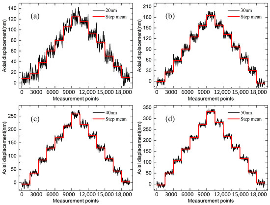 Experimental results of axial resolution for different steps: (a) 20 nm; (b) 30 nm; (c) 40 nm; (d) 50 nm.