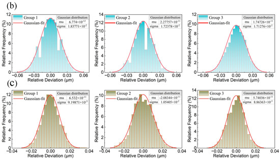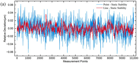 The dynamic stability experiment was conducted by maintaining the same conditions as the static stability experiment, ensuring continuous signal capture by the sensor as the nano-positioning stage moved. The nano-positioning stage was controlled to move unidirectionally along the longitudinal axis for 4 mm, with the entire process recorded using a spectrometer. A total of 10,000 data points were collected, and the experiment was repeated four times for each type of sensor. To calculate the relative deviation for three motion cases, the values from the last three measurements were subtracted from the values of the first measurements by starting point alignment. Outliers were removed before plotting frequency histograms, followed by Gaussian fitting. The difference in dynamic stability between the two sensors is shown in Figure 12a. The measurement results showed that the maximum deviation for the line spot sensor was 0.053 μm, with a standard deviation of 0.013 μm, while the maximum deviation of the point spot sensor was 0.315 μm, with a standard deviation of 0.064 μm (Figure 12b,c). In the scanning measurement process, the most direct interference is the vibration and angular pendulum of the measured object in the process of movement. From the experimental results, it can be observed that the point spot sensor often has several-hundred-nanometer jumps during the continuous scanning measurement process, while the line light spot sensor is relatively smooth throughout the scanning process. It is also found that the static stability standard deviation and dynamic stability standard deviation of the line spot sensor only differ by a few nanometers, while the difference in the point spot sensor is tens of nanometers. It is evident that the line spot sensor can obviously eliminate the influence of vibration and angular pendulum and other disturbances during the continuous scanning measurement process, and improve the stability of the sensor’s dynamic measurement.