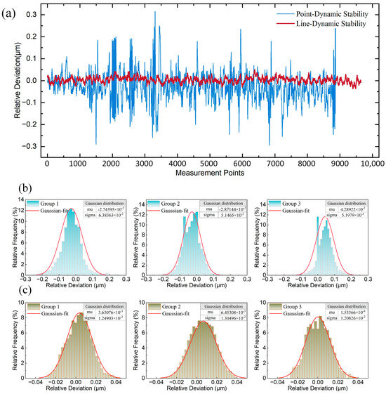 Static stability analysis: (a) Point-line spot static stability differences; (b) Point spot static stability frequency histogram and Gaussian fitting; (c) Line spot static stability frequency histogram and Gaussian fitting.