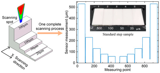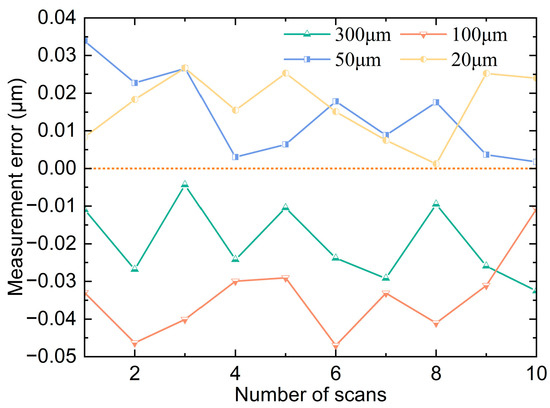 The sensor is fixed vertically on the liftable air-bearing guide rail, and then the sample with four standard steps of 300 μm, 100 μm, 50 μm, and 20 μm is fixed on the two-dimensional motion platform, and the distance between them is adjusted so that it can complete the scanning of the whole step sample. The relative position relationship between the scanning spot and the step and the scanning process are shown in Figure 13, which controls the two-dimensional motion platform to reciprocate in the X direction at a speed of 5 mm/s, straightness 0.015 μm, and flatness 0.020 μm in the X direction of the platform. A total of five sets of scans are performed to obtain ten step scanning results. An average of 80 data points were measured by each step sensor, and their average value was calculated as the current step measurement. The error curves of the ten scan results are shown in Figure 14, where the maximum value is −0.047 μm, and the standard deviation of the ten measurement errors for each step is 0.011 μm at maximum. From the experimental results, it can be concluded that the line light spot sensor has better accuracy and stability during the scanning process.