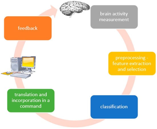 Figure 1 illustrates how a closed feedback loop system [10,11] functions, following a predetermined procedure common to all kinds of brain–computer interface (BCI) systems. The six main steps in this process are as follows: brain activity measurement, which records neural signals; preprocessing, which removes noise or artefacts that might skew the signal; feature extraction, which finds pertinent patterns in the data; classification, which deciphers these patterns to ascertain the user’s intent; translation and integration, which transforms the intent into a specific command; and feedback, where the system gives the user real-time responses to help and inform them during the interaction.