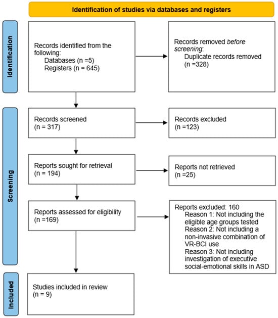 The PRISMA principles also established a comprehensive and transparent methodology in our systematic review on the use of brain–computer interfaces (BCIs) and virtual reality (VR) to ameliorate core symptoms in ASD. This method improved the reproducibility, dependability, and trustworthiness of our findings by offering a strict structure for the identification, selection, and critical assessment of pertinent research studies. With regard to the final chosen studies that were examined, this systematic review aims to address the following research questions.