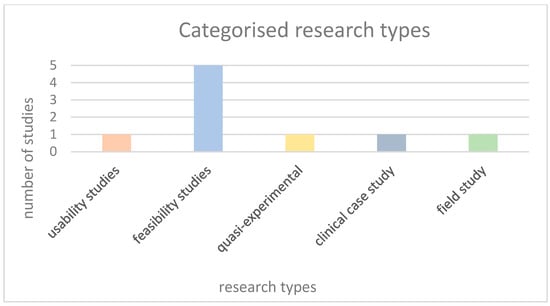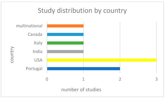 The final study selection concerned children and adolescents of school age, including some pre-schoolers in one case and some others close to twenty in another. A total of n = 77 target group participants were analysed. The control group consisted of n = 9 participants, indicating the difficulty in recruiting ASD youngsters to take part in this kind of research. Specifically, out of nine studies, only two had control groups. The mean age of the participants was n ≈ 12.59. (See Figure 4). According to the participants’ gender, n = 50 were males, n =1 was female, and n = 26 were not gender-specified. The figures indicate the male over female prevalence in ASD. Regarding the country of the study origin, we observed n = 2 [34,35] from Portugal, n = 3 from the USA [36,37,38], n = 1 from India [39], n = 1 from Italy [40], n = 1 from Canada [41], and n = 1 multinational, including the USA and India [42]. According to the study design, the researchers established several different kinds of methodologies. These include quasi-experimental designs [42], feasibility studies [34,37,38,39], usability studies [36], clinical case studies [40] , and field studies [41]. (See Figure 5 and Figure 6). Additionally, the treatment results were assessed either by psychometric tools like SCQ, SRS, NEPSY [36], POMS, JAAT, ATEC, VABS [35], CARS [39], CGI, ADOS2, LEITER-R, and CARS2-ST [40] or by expert therapists and/or parents/caregivers, as in [36,37,38,41]. Finally, in two studies [34,42], the type of assessment was not specified.