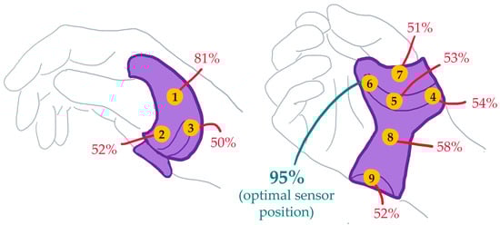A single board computer was employed to obtain data, determine the status of orthosis wear, and output this result securely. The CR2032 coin-cell battery powered MMC board was chosen, as it allowed the integration of peripheral pressure sensors whilst also having a built-in accelerometer and the option of incorporating a built-in temperature sensor. Furthermore, it also has the capability to connect via Bluetooth to a smartphone app which can sync and download data obtained from the sensors in real-time. The optimal position for the FSR within the orthosis was selected after nine suitable positions were chosen using landmarks on the orthosis and then tested. Wear time results were obtained from the FSR whilst a user donned and doffed the orthosis 10 times for each position. Wear time was estimated using a threshold value obtained through preliminary testing after which the FSR’s accuracy at each position was calculated as the percentage agreement between actual and estimated wear time (Figure 2). The final prototype consisted of the FSR attached to the MMC board (Figure 3), fitted in an off-the-shelf plastic enclosure with a VELCRO® handle fixed to enable the device to be attached to the straps of the orthosis (Figure 4). The MMC board, containing the accelerometer, was positioned in parallel to the base of the device’s enclosure and facing upwards in the dorsal direction of the hand when the orthosis was worn.