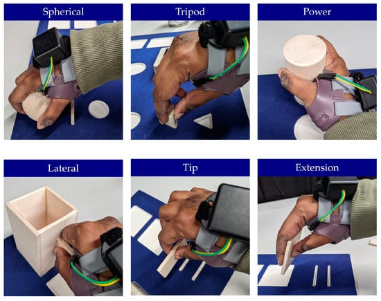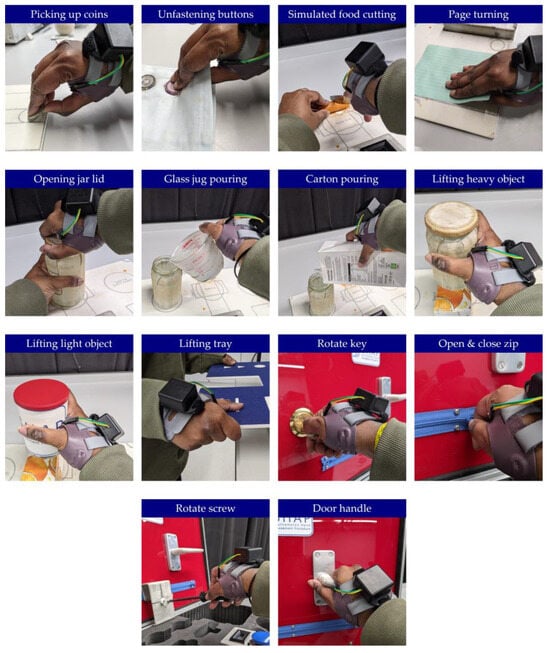 Participants were provided with an instrumented orthosis that best fit their dominant hand’s circumference (left or right in size small, medium, or large), as recommended by the Push® ortho Thumb Brace CMC guidance. Following this, participants were given instructions on how to wear the instrumented orthosis and were asked to don and doff it. The times that the orthosis was worn and taken off were recorded both by timestamping on a computer and through an app collecting the data. To investigate the device’s accuracy during repeated orthosis use, the first part of the laboratory testing protocol consisted of the participant donning and doffing the orthosis ten times. Following this, the second part of the study focused on analysing the device’s accuracy during typical daily activities an orthosis user may complete. Thus, whilst wearing the orthosis, participants were asked to perform the Southampton Hand Assessment Procedure (SHAP), which consists of interaction with six abstract objects (Figure 5) and performance of fourteen ADLs that require grip (Figure 6) [46]. For each activity participants timed themselves using the SHAP timer by pressing start before they commenced the activity and stop after they completed the activity. To log wear time objectively, the investigator logged timestamps on a spreadsheet to mark when users donned and doffed the instrumented orthosis and when they started and stopped each activity of the SHAP. To minimise and avoid the effects of fatigue, participants were given one minute to rest between each of the activities. Once complete, participants were asked to fill out a short questionnaire regarding the comfort of the instrumented splint. The survey consisted of questions asking participants, on a scale of 1 to 10, how comfortable it was to wear the orthosis instrumented with the device, how comfortable they believed it would be to wear the instrumented splint for a longer period, and how easy it was to remove and replace the battery. The survey also offered participants the opportunity to provide feedback regarding possible improvements. Each session lasted no longer than 1.5 h.