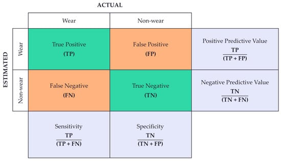 The accuracy of the device was reported as the ability to identify true positives correctly (sensitivity), the ability to identify true negatives correctly (specificity), the proportion of positive results that are true positives (positive predictive value), and the proportion of negative results that are true negatives (negative predictive value) (Figure 7). To assess the device’s reliability and level of agreement between logged and estimated wear time, the Cohen’s kappa was calculated and interpreted [47].