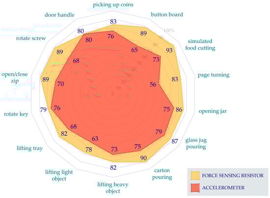No difference was found between FSR and accelerometer-based wear time estimations (p = 0.733). Furthermore, no differences were found between the accuracies at the original sampling rate (1 Hz) and each simulated sampling rates for both FSR and accelerometer-determined wear time estimations (p > 0.133). During the first part of the SHAP, there were no differences in the accuracy of wear time estimations between FSR and accelerometer-derived estimates (p > 0.176). However, during the completion of the ADLs in the second part of the SHAP, FSR-based wear time estimations were more accurate than those obtained by the accelerometer during the button board activity (p = 0.000), simulated food cutting (p = 0.009), carton pouring (p = 0.019), and when rotating a screw (p = 0.006) (Figure 8).