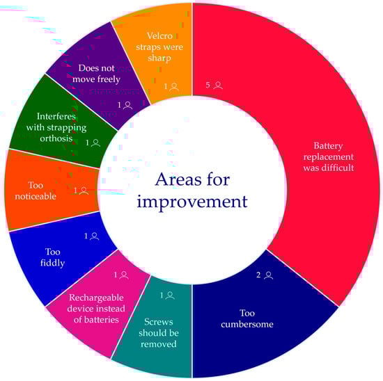 Feedback received on a scale of 1 (low) to 10 (high) revealed that users generally felt comfortable wearing the orthosis instrumented with the device during the protocol (7.54 ± 1.37) but believed it would be less comfortable to wear for longer periods (6.40 ± 1.64). The process of removing and replacing the battery was also the most frequent concern reported by users (Figure 9).