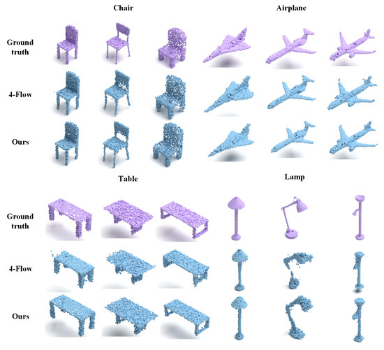 Specifically, for the 3D generation task, we compare the current mainstream generative models, such as the GAN [58] and flow-based [33,60,61] methods. From Table 1, it is observed that our PAPRec outperforms the others in both CD and EMD. From Figure 2, the improvement of the lamp category is particularly obvious, which indicates that PAPRec has greater effectiveness and a stronger capacity to represent diverse shapes.