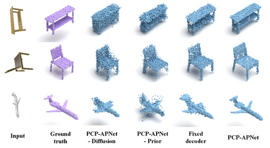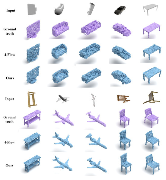 For the single-view reconstruction task, we compare several reconstruction methods [33,42,43,61,79]. Among them, DPF [61] is closest to us, and it also regards the point cloud as the distribution of samples and uses the normalized flow model for decoding. 4-Flow [33] realizes the parallel decoding of four normalized flows to reconstruct the overall shape and makes a slight improvement on DPF, showing better optimization. However, 4-Flow cannot generate good details. From Figure 3 and Table 2 and Table 3, it can be ssen that PAPRec is superior to the current mainstream single-view reconstruction methods in both quantitative and qualitative results. PAPRec owes its superiority to two key aspects. It uses a diffusion probability decoding network for the gradual refinement of point cloud reconstruction, and integrates a flow model to learn features of the point cloud’s overall distribution. Moreover, PAPRec uses 3D point cloud priors to guide single-view image reconstruction and accurately capture local and global information during 3D point cloud generation.