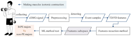 As shown in Figure 1, this study attempts to propose an applicable method for universally evaluating muscle training effectiveness under isotonic contraction by extracting sEMG features using statistical analysis methods. The feature subspace includes key TD and FD features of arm muscles during isometric movements. The ML method based on the feature subspace can distinguish B-PE and non-PE students, suggesting that extracting the feature subspace will be affected by basketball training. The redundancy of feature vectors is reduced, and the effectiveness of feature vectors is validated using a machine learning (ML) classifier. The results can be applied to the graded physical teaching and training for athletes, which provides a reference for the study of the universal sEMG characteristics across multiple muscle groups during isotonic contraction exercises.