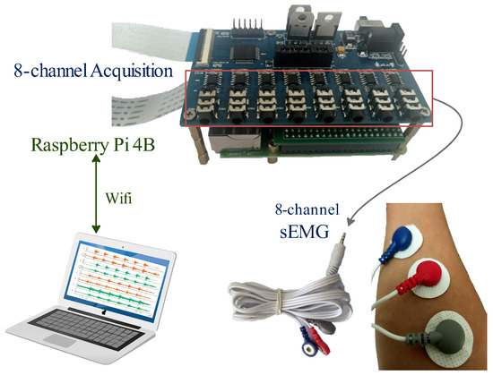 Tripolar electrodes were used to collect differential voltage signals from sEMG. The arrangement of the button electrodes and preamplifier [26] is illustrated in Figure 2. We used disposable electrodes to obtain high-quality signals. During dynamic conditions, sweat and skin movement can compromise electrode adhesion, typically degrading signal quality within 1 to 3 h. The three electrodes were arranged in blue, red, and gray order, each with a diameter of 25 mm and a buckle size of 3.9 mm. The homemade preamp [11,27], multi-channel analog acquisition supports up to 8 channels of sEMG, which can eliminate some signal artifacts and amplifies the original EMG voltage value by 2000 times. Eight sEMG adhesive button electrodes, along with their data cable (ZTEMG-1300, ZhiTuo, Qingdao, China), were connected to the 16-bit precision analog-to-digital converter (AD7606) on the amplifier circuit board. The Raspberry Pi 4B served as the main control board, receiving data via an I²C interface from the preamplifier. The data were then transmitted to a PC via WiFi for subsequent analysis with a sampling frequency of 1000 Hz.