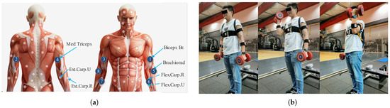 Data collection implementation program: target muscles to be detected (a), and standing alternating dumbbell curl (b). Sensors 1, 2, 5, and 6 are positioned on the biceps, triceps, brachioradialis, and flexor carpi muscles of the left arm, respectively. Symmetrically, sensors 3, 4, 8, and 7 are placed in the corresponding locations on the right arm in the same order.