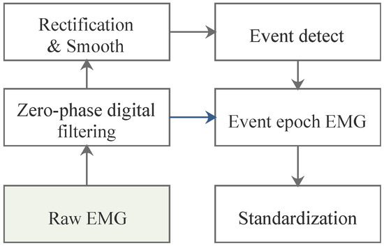 The complete procedure for preprocessing and event detection is illustrated in Figure 4. First, all the raw signals were filtered to reduce noise. Simultaneously, events were detected to identify the starting and ending points of each arm curl motion, which were defined as active epochs. We then extracted all epochs from filtered data. To enhance event detection results, we applied rectification and smoothing processes. Without these steps, the extracted EMG signals from the detected event epochs would have lost valuable feature information. Finally, all activity segment samples from 80 sets (grouped by 10 subjects across 8 channels) were standardized separately.