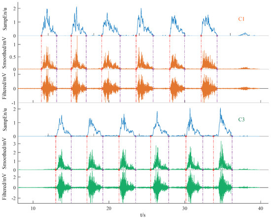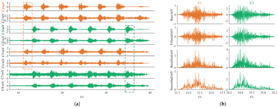 Firstly, a zero-phase filter [31], specifically, a 4th-order 20–250 Hz bandpass Butterworth filter, was applied to remove baseline drift and measurement noise from the raw data. Since power frequency notch filtering has already been performed in the analog circuits, tests have confirmed that repeatedly conducting digital power frequency notch filtering can lead to excessive loss of useful information, adversely affecting subsequent event detection and feature extraction. Therefore, we chose not to perform power frequency bandstop filtering in this case. To extract the active epochs in the filtered signals, half-wave rectification and moving average smoothing with a span of 5 were applied. This process smoothed the signal, facilitating the next step in sample entropy-based active segment detection. It is important to note that the rectification and smoothing were solely for event detection; the final event epoch data used for feature analysis were extracted from the filtered signal, which retained 50% of the energy. Taking the C1 and C3 data segments intercepted from Figure 5a as an example, the effects of the three-stage preprocessing are illustrated in Figure 5b. Note that the signals from the other six channels were only filtered, without undergoing rectification.