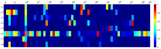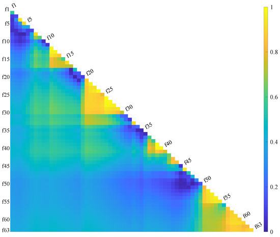 Consistency and correlation between every two features. The color means the intraclass correlation coefficient. fx means the x-th feature. The closer it is to yellow, the higher the consistency, and blue means non-consistency. We believe that the performance of two features with coefficients greater than 0.8 is consistent, as with [f7, f8], [f11, f12, f13, f14]; [f15, f16]; [f20~f30]; [f32, f33]; [f38~f41]; [f42~f44]; [f51~f55]; and [f57~f63]. All of these are feature groups with significant correlation that can reduce redundancy.