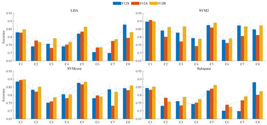 Figure 10 displays the classification results, including the mean accuracy and error, for models trained with the four machine learning methods across three feature combinations on eight sEMG channels. The mean of the 20 replicates ensured the reproducibility of these experimental results. Among the four methods, the F12B feature group exhibited superior performance compared to F12A and F12x, yielding the highest average accuracy with relatively small variations across channels (as shown by the line chart amplitude fluctuations for each group). F12X achieved relatively high accuracy in identifying C8 channel signals using the LDA method, but its accuracy fluctuated significantly across channels, resulting in poorer overall performance. Overall, we selected the F12B feature group as the key parameter to differentiate the upper arm muscle groups of B-PE majors with long-term exercise from those of regular students.