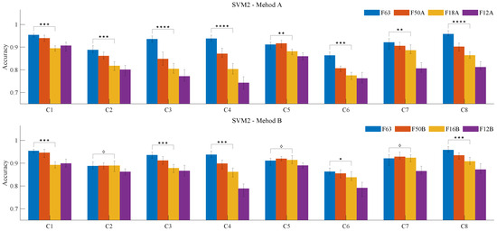 As shown in Figure 11, the model accuracy of Method B decreased more gradually across the three stages. We performed a quantitative analysis of the significant differences in classification accuracy between feature groups F18A and F16B, generated in the second step of each method, and feature group F63. The results are indicated in the figure; a diamond shape indicates no significant difference in the classification accuracy for different feature combinations based on a t-test at the 0.05 significance level, suggesting that certain feature groups, such as F63 and F16B, can be used interchangeably for channels C2, C5, and C7. More asterisks (*) represent a greater significance level, indicating a notable decrease in classification accuracy. Using F63 as the baseline, Method B typically showed a smaller reduction in accuracy compared to Method A, likely due to the exclusion of channel 6 features during training, which may have helped reduce noise in the samples. For a more intuitive expression of significance, we used the absolute decibel value of the p-value (see Equation (18)) as an indicator of classification accuracy differences between the target feature group and F63 in the trained SVM2 models. Higher values represent greater significant, while values <= 1.301 (p = 0.05) indicate no significant difference. As shown in Table 3, x-y represents a comparison between the x-th and y-th bars. Except for special channel and feature matching cases (such as [C1, 1-4]), Method B typically outperformed Method A in feature extraction across the various stages, with significant improvements in classification performance. The difference in classification accuracy caused by feature reduction was smaller.