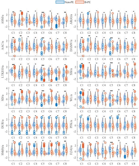 The distributions of features within F12B are compared between the B-PE group and the non-PE group. Here, u shows that the normalized feature is unitless. ♢ , * , ** , *** .