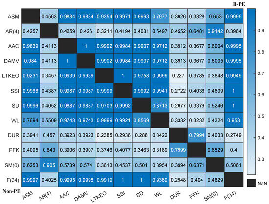 Additionally, we performed a statistical analysis to examine the effects among variables. For the F12B feature set, a one-way ANOVA was performed across the 12 features for specific subject groups and channels to determine p-values and assess significant differences between groups, as shown in Table 4. The results indicate no significant differences among the features for channels 3, 6, and 7. For the remaining five channels, where significant differences were found, post hoc analyses using the Tukey HSD test yielded pairwise p-values to clarify which specific groups exhibited statistically significant differences. Figure 13 illustrates the average significance of pairwise feature differences across these five channels. In the figure, the lower-left corner represents the non-PE group, the upper-right corner the B-PE group, and the diagonal shows the null value. Several time domain features—ASM, AAC, DAMV, LTKEO, SSI, SD, and WL—demonstrate strong correlations with one another. Features AR(4) and SM(0) show high mutual correlation but low correlation with other time domain features. Meanwhile, DUR, PKF, and SM(0) exhibit low correlation with other features. Notably, the wavelet packet decomposition feature F(34) is highly correlated with most time domain features, except AR(4). The results suggest a potential correlation between these features, showing consistent patterns for both the non-PE and B-PE groups.