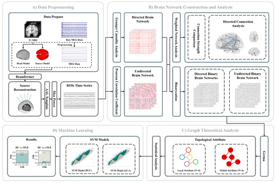 Overview of the experimental workflow. (A) Data Preprocessing: This phase includes the preprocessing of MEG data, the construction of head and source models using T1-weighted MRI, and source reconstruction with the beamformer algorithm to derive regional brain signals. Brain regions are then parcellated according to the AAL116 atlas, and representative signals are extracted based on the maximum power values. (B) Brain Network Construction and Analysis: This section includes brain network construction, brain network binarization, and weighted network analysis. Directed brain networks are established through Granger Causality Analysis (GCA), while undirected networks are formed using the Pearson Correlation Coefficient (PCC). Both networks are binarized using a Global Cost Efficiency (GCE) approach. Weighted network analysis includes comparing connection strengths, evaluating directed connectivity and out-degree metrics, and identifying hub regions. (C) Graph Theoretical Analysis: The analysis focuses on extracting four global topologies: Global Clustering Coefficient (GCC), Global Characteristic Path Length (GCLP), Global Efficiency (GE), and Global Local Efficiency (GLE); and four local topologies: Node Clustering Coefficient (NCC), Node Efficiency (NE), Node Local Efficiency (NLE), and Node Degree Centrality (NDC) from the binarized brain networks. (D) Machine Learning Application: Support Vector Machine (SVM) is utilized to classify topologies with differences of p < 0.05, highlighting differences between the two methodologies.
