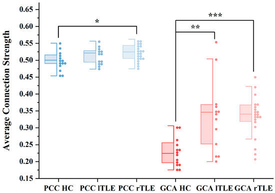 Average connection strengths based on PCC and GCA methods. Blue boxplots represent average connection strengths using the Pearson Correlation Coefficient (PCC) method for healthy controls (HCs), left temporal lobe epilepsy (lTLE) patients, and right TLE (rTLE) patients. Red boxplots represent average connection strengths using the Granger Causality Analysis (GCA) method for HC, lTLE, and rTLE. Abbreviations: PCC HC, PCC lTLE, and PCC rTLE denote HC, lTLE, and rTLE using the PCC method, respectively. Similarly, GCA HC, GCA lTLE, and GCA rTLE denote HC, lTLE, and rTLE using the GCA method. (*) indicates statistical significance between HC and lTLE, as well as between HC and rTLE, assessed using a t-test. * p < 0.05, ** p < 0.01, *** p < 0.001.