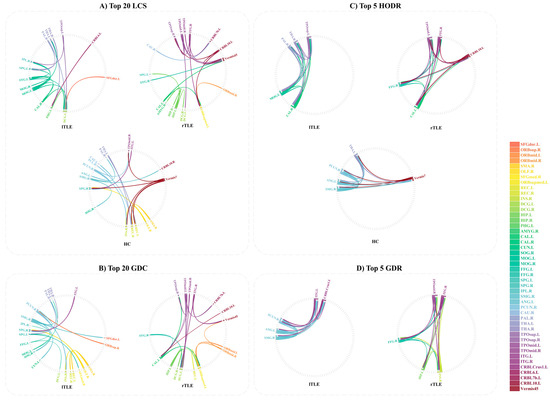Comparing the results obtained from the above four types of connections, we discovered that the hub brain regions common to both lTLE and rTLE patients primarily include the following regions, which were hippocampus, thalamus, fusiform gyrus, temporal pole, inferior temporal gyrus, median cingulate and paracingulate gyri, calcarine fissure and surrounding cortex, as well as the superior and middle frontal gyrus. Furthermore, in lTLE, additional regions encompass the middle occipital gyrus, inferior and superior parietal gyrus, supramarginal gyrus, and precuneus. In rTLE, the additional region is the cerebellum. The hippocampus and thalamus are part of the limbic system and involve emotions, learning, and memory [40,41]. The fusiform gyrus contributes to the ventral visual-processing stream, potentially associated with cognitive impairments observed in TLE [42]. The temporal pole and inferior temporal gyrus are involved in transforming sensory input into derived significance, preserving visual memory, and language comprehension [43,44]. The median cingulate and paracingulate gyri are part of the cingulate cortex involved in emotional and behavioral regulation [45,46]. The calcarine fissure and surrounding cortex are primarily responsible for vision [47]. The superior and middle frontal gyrus are implicated in voluntary movement, attention, short-term memory tasks, motivation, planning, and speech [46]. The middle occipital gyrus is part of the occipital lobe and is primarily responsible for vision [46]. The inferior and superior parietal gyrus plays a role in integrating sensory information from various body parts, understanding spatial relationships, and body orientation [46]. The supramarginal gyrus is part of the somatosensory association cortex, which is responsible for interpreting tactile data and engaging in spatial and body position perception [48]. The precuneus is involved in various functions, including visual–spatial imagery, episodic memory retrieval, and self-processing operations [49]. Our study identified key hub regions that overlap with findings by Coito et al. [7,8], who used EEG data and the weighted partial-directed coherence (wPDC) method to compare HC and TLE patients. Significant overlap was observed in the hippocampus, fusiform gyrus, calcarine fissure and surrounding cortex, as well as the superior and middle frontal gyrus. Additionally, our Top 20 LCS analysis identified the parahippocampal gyrus and amygdala, while the Top 20 GDC analysis highlighted the olfactory cortex. Although these regions appeared less frequently and were not classified as primary hub regions, their presence remains noteworthy.