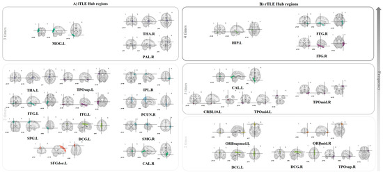 Hub regions in TLE. This figure illustrates the hub regions of brain networks in patients with lTLE and rTLE. The hubs are identified based on their frequency of appearance in different analyses. (A) lTLE hub regions: hub regions in patients with lTLE. (B) rTLE hub regions: hub regions in patients with rTLE. Arrows indicate the increasing frequency of hub regions from bottom to top in each section. Each brain slice shows the anatomical location of these regions and is visualized using axial, sagittal, and coronal brain slices.