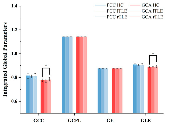 Global topological parameters of brain functional networks in lTLE patients, rTLE patients, and HC. In the bar graph, black lines indicate data ranges and bars depict means. (*) indicates: p < 0.05, as determined by the Mann–Whitney U non-parametric test.