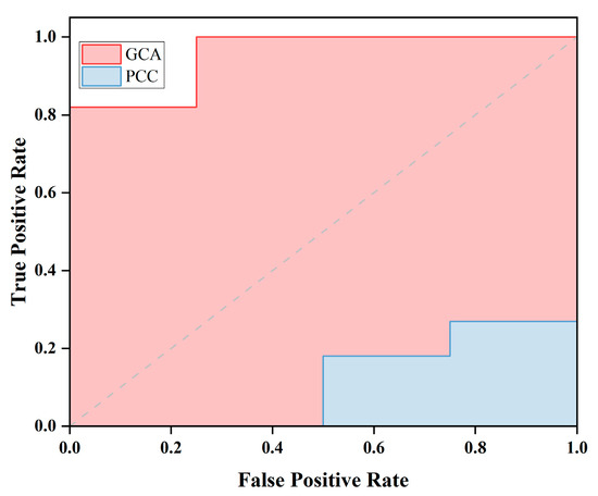 Using MEG directional brain networks combined with SVM, we conducted classification between TLE patients and HC. We employed various directed graph metrics to investigate different aspects of brain network integration and centrality. Through these measures, we were able to identify differences in brain networks between TLE patients and HC individuals, achieving an 80% correct identification rate, as shown in Table 3. The ROC curve results depicted in Figure 6 demonstrate that our proposed method based on GCA outperforms the conventional PCC method in discriminating between TLE patients and HC individuals. These results indicate that the proposed directed network measures could serve as biomarkers for diagnosing TLE. Consistent with previous studies highlighting the superiority of directed networks over undirected networks, these findings underscore the potential of directed network models in identifying neurological disorders in the brain [5,6].