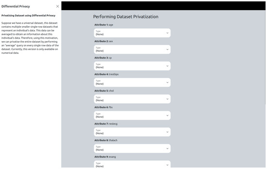 In developing an application based on differential privacy, we explored various differential privacy libraries, including Google’s DP libraries, PyTorch’s Opacus, SecretFlow, IBM’s Differential Privacy, TensorFlow Privacy, OpenDP, and OpenMined/PyDP [37]. Since our application focuses on statistical releases, we considered libraries that support differential privacy in this context. We narrowed our options to Google’s DP libraries, IBM’s Differential Privacy, OpenDP, and OpenMined/PyDP. We ultimately chose OpenDP (https://docs.opendp.org/en/stable/index.html (accessed on 24 June 2024)) due to its active community and the library’s overarching goals. OpenDP offers a flexible framework for implementing differential privacy, allowing users to select different mechanisms as needed. Additionally, OpenDP has a broader definition of privacy that encompasses essential components that are often overlooked by other libraries. The extensive documentation provided by OpenDP is also invaluable for user education. The most compelling reason for our choice is the active and inclusive community, which encourages public contributions and innovation. With these factors in mind, we selected OpenDP as the backend for differential privacy in our application.