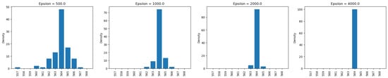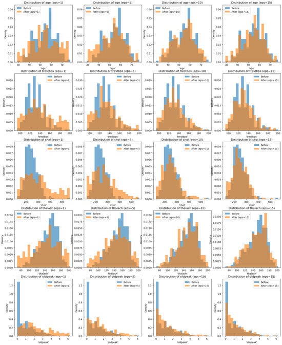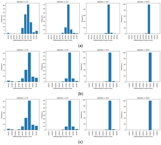 Based on Figure 11, we observed that the greater the epsilon value, the closer the distribution of the privatized dataset was to the actual dataset containing sensitive data. This suggests that the method approached the concept of a private dataset that was as defined earlier. As the epsilon value increased to ∞, the distribution was expected to closely resemble the actual dataset as there would be no privacy guarantee. Thus, this method may be useful in specific situations for privatizing an entire dataset.