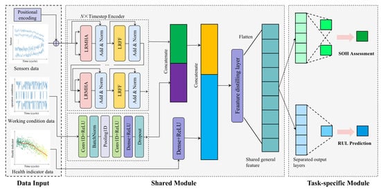 The MTL structure was designed using a Transformer and 1D-CNN as its backbone. Figure 1 presents an overview of the proposed MTL method for implementing multi-condition SOH evaluation and RUL prediction. The proposed MTL model consists of three main modules: