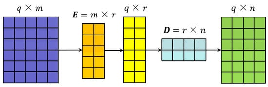 Low-rank matrix decomposition was adopted in the linear layers for sensor input data in the Transformer model. The linear layer with low-rank matrix decomposition is referred to as the linear encoder-decoder (LED) unit [31]. As shown in Figure 2, the LED decomposition requires a parameter matrix in the original linear layer for sensor linear processing, which involves parameters. However, with the introduction of low-rank matrices, only two smaller matrices, and , are needed to approximate the parameter matrix, resulting in . and require parameters during computation. If the rank used in the low-rank decomposition is set to a value much smaller than parameters and , the parameter quantities in and are significantly smaller than those in .