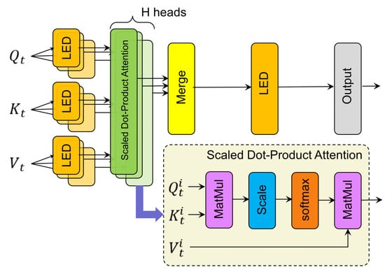 where represents the output of the self-attention mechanism at the -th time step; is the number of heads; represents the output features of LRMHA; represents the concatenation operation across multiple heads; and , , , , and , , , represent the address encoder matrices for query projection, key projection, value projection, and output projection, respectively.