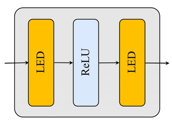 Subsequently, the LRFF network is utilized to enhance the model’s capability to represent nonlinear features while simultaneously improving the computational efficiency of feature processing at the corresponding level, as illustrated in Figure 5. The LRFF architecture is composed of two LED units, with a ReLU activation function applied between them. This design enables effective nonlinear transformation and feature representation. The output of this architecture can be mathematically expressed as: