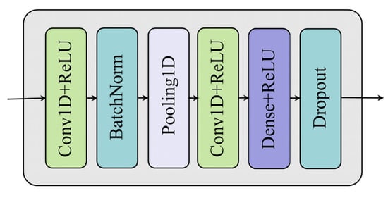 For multi-condition feature extraction, identifying corresponding features allows for more precise detection of performance variations in mechanical equipment operating under diverse conditions. CNNs, a specialized type of neural network, are well-suited for this purpose. CNNs process data through multiple convolutional stages, making them highly effective for feature extraction in both image [32,33] and sequential data [34,35] applications. To capture distinct operating condition features, a 1D-CNN network model was constructed in the shared layers of the MTL. The 1D-CNN architecture learns local patterns of one-dimensional multi-condition data through alternating convolution and pooling operations, which are subsequently fused with sensor data features. As shown in Figure 6, this network architecture primarily consists of two convolutional layers, a batch normalization layer, pooling layers, dense layers, and a dropout layer. The batch normalization layer is incorporated after the convolutional layers to stabilize the training process by normalizing feature distributions, while pooling layers are used to adjust the dimensionality of the extracted operating condition features. Dropout is applied to prevent overfitting and enhance the generalization capability of the network. The convolutional process in this architecture is mathematically represented as follows: