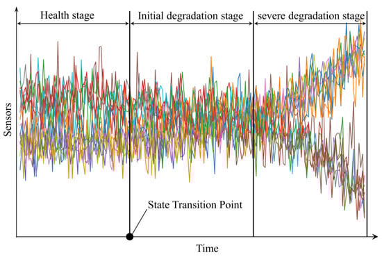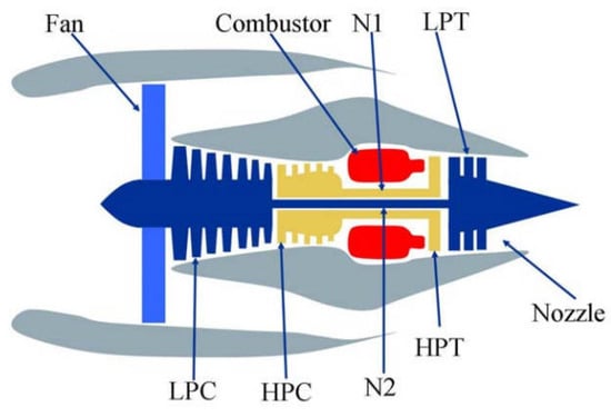 To validate the performance of the improved method, it was applied to a simulated degradation dataset of aircraft engines generated using the Commercial Modular Aero-Propulsion System Simulation (C-MAPSS) tool [40]. As shown in Figure 8, the data originated from a simulation model of a turbine engine structure with 90,000 pounds of thrust. The C-MAPSS model, known for its detailed fault mode designs and diverse operating conditions, is widely used in the field of RUL prediction. Its operating conditions include: (1) altitude ranging from ground level to 40,000 feet; (2) Mach number between 0 and 0.90; and (3) sea-level temperature ranging from 60 °F to 103 °F.
