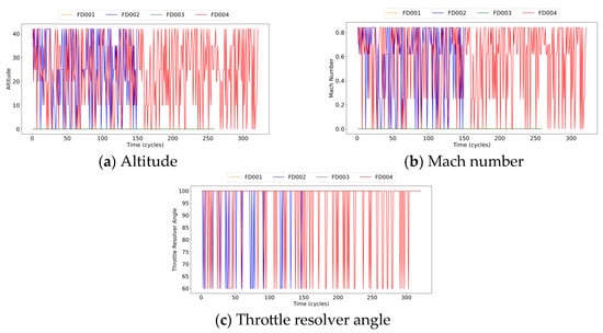 Based on this simulation model, the C-MAPSS dataset records time series data reflecting engine performance degradation and is organized into four subsets: FD001, FD002, FD003, and FD004. Each subset comprises a training set and a test set, with the test set including RUL labels for the engines. The dataset contains 26 features, of which 21 are operational signals measured by sensors, 3 are operational environment variables (altitude, Mach number, and temperature), and the remaining 2 correspond to the engine’s unique identifier and cycle count. The specific parameters of the sensor data are detailed in Table 1. To enhance data realism, the initial wear levels of the engines vary across the dataset. The FD001 and FD003 subsets represent engine performance degradation under single operating conditions, while FD002 and FD004 capture degradation across six different operating conditions. Given the significant impact of operating condition changes on engine performance, experiments were conducted on all four subsets to evaluate the proposed model’s effectiveness in SOH assessment and RUL prediction under complex conditions and diverse fault modes. Figure 9 illustrates the variation trends of operational monitoring data for Engine #1 in the training datasets FD001 and FD002. As shown, in FD001 and FD003, the operating conditions remained stable, whereas in FD002 and FD004, parameters such as altitude, throttle angle, and Mach number fluctuated continuously. Therefore, incorporating the impact of operating condition variations into the model can significantly improve prediction accuracy and enhance the model’s applicability and reliability in real-world scenarios.
