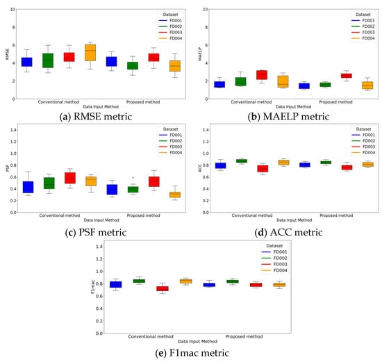 To further evaluate the proposed method’s performance on multi-condition datasets, an ablation experiment was conducted to analyze the impact of different input methods on model performance. The input data was divided into two approaches: the conventional method, which integrates condition data into sensor data, and the proposed method, which extracts condition features independently. In the conventional fusion approach, the 1D CNN network responsible for extracting condition features was removed, while other parts of the model remained unchanged. To minimize the effect of random initialization, each model configuration was run 10 times on the same dataset. Figure 11 shows a comparison of the performance of the two input methods across the four datasets. For the single-condition datasets FD001 and FD003, as shown in Figure 11, the performance of both methods was consistent across all metrics. This is because, under single-condition scenarios, variations in condition features have a limited impact, and the model’s predictions rely predominantly on operational states reflected in the sensor data. However, for the multi-condition datasets FD002 and FD004, the proposed method of independent condition feature extraction significantly outperformed the conventional fusion method in capturing condition complexity. This demonstrates the clear advantage of the proposed model in predicting under complex operating conditions. Notably, as shown in Figure 11d,e, in evaluating ACC and F1mac metrics for FD002 and FD004, the conventional fusion method slightly outperformed the condition feature separation method. This could be due to the high complexity of classification boundaries in multi-condition tasks. By integrating condition data, the conventional method increased data dimensionality during feature extraction, enabling the feature extractor to capture subtle differences between classes more effectively. This helps the model define classification boundaries more accurately in these specific metrics. Despite this slight advantage in classification metrics, the proposed method significantly outperformed the conventional method in RUL metrics and was only marginally inferior in SOH metrics. This indicates that the independent condition feature extraction method offers superior predictive performance in capturing condition features, emphasizing its importance in distinguishing influential factors and enhancing feature differentiation. Overall, these results highlight the critical role of condition data in prediction tasks and underscore the effectiveness of separating and independently extracting condition features for improved model performance.